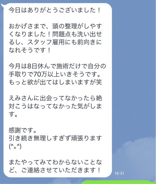 今月は8日休んで施術だけで自分の手取りで70万以上いきそうです。 もっと欲が出てはしまいますが笑